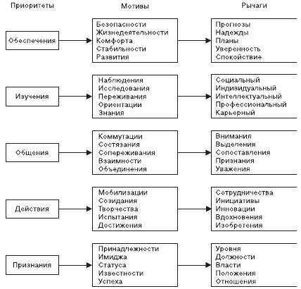 Исследование, совершенствование и использование индивидуального спектра мотивов побуждения конкретного работника к запланированному действию является важнейшей задачей современного менеджера. Ее успешное решение во многом зависит от полного и всестороннего позиционирования комплекса последовательности приоритетов, мотивов поведения работника и рычагов их использования. В самом общем виде модель содержания и классификации такого комплекса представлена на рис. 4.1.1. Данная модель агрегирует пять приоритетов мотивов поведения работника в соответствии с последовательностью реализации его основных потребностей. При этом действие одного из мотивов каждого приоритета раскрывается возможностью применения определенной палитры конкретных рычагов, универсально обеспечивающих осуществление мотивации личности в рамках единой социальной архитектоники и содержание данной модели существенно отличаются от чаще всего рассматриваемых социологами и психологами конфигураций, например, «потребностей по Маслоу», поскольку отражает организационный подход к представлению палитры, содержания и последовательности формирования и развития мотивации работника. Им обеспечивается не только и не столько классификация мотивов поведения, сколько их органичная преемственность, взаимосвязь, группировка и взаимодействие со стимулами на основе действия универсальной системы рычагов мотивации.