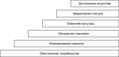 Исходным условием, объективной основой и конструктивным инструментом мотивации является процесс возникновения, становления и развития сознания индивида как формирование потенциала его самоорганизации. В этом смысле самоорганизацию индивида можно квалифицировать как целенаправленную и осознанную систематизацию его восприятия, осуществляемую на основе аналитической умственной деятельности по упорядочиванию представлений и овладению действиями. Под этим подразумеваются исследование и формирование представлений индивида, направленных на самого себя, осмысление и обеспечение удовлетворения собственных потребностей, накопление и развитие необходимых знаний, оценку личных качеств и овладение организационными навыками, обогащение культурой общества, достижение определенного уровня развития личности, получение и закрепление социального статуса. Этот процесс можно представить в виде шести соответствующих стадий самоорганизации, формирующихся с возникновением сознания индивида и последовательно осуществляющихся и развивающихся на протяжении всего жизненного цикла (рис. 4.2.1).