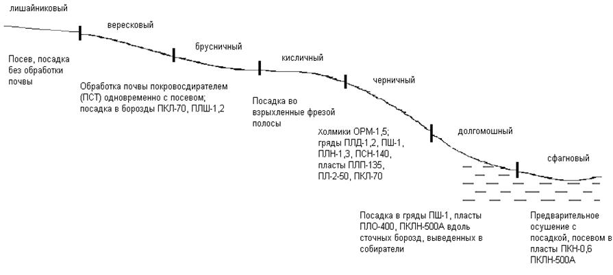 | Гигрофильные (сырые) – 4, депрессии, западины Ультрагигрофильные (мокрые) – 5, болота | Микроповышения (гряды, пласты, валы, гребни) высотой 0,35 – 0,40 м, шириной 0,8-1,0 м вдоль сточных лесокультурных борозд с устьями в водоотводящих каналах постоянной гидромелиоративной сети | Маркировка осей прохода трактора Узкополосная, корчёвка пней корчевателем Д-695 (Т-100МБГС) | Плуги ПКЛН-500А, ПКН-0,6, ПШ-1 (ЛХТ-100,Т-130) | |