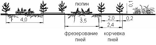 Примечание .* - Маркировка рядов культур и пониженная при рубке древостоя высота пней позволяют использовать для междурядных уходов катки-осветлители и другую технику.