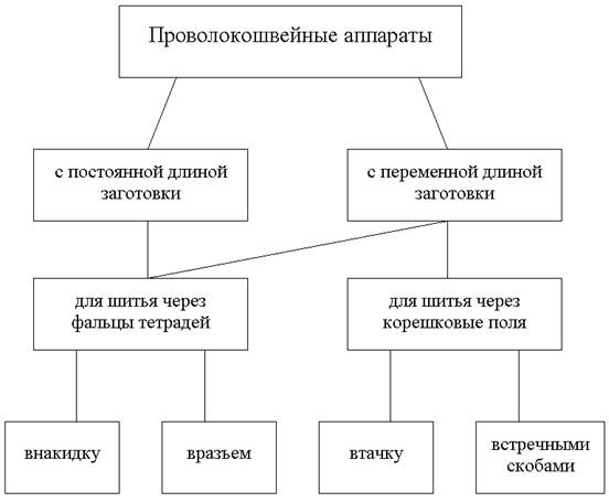 Классификация проволокошвейных машин зависит от конструкции швейных аппаратов. На рис. 71 представлена классификационная схема, показывающая разновидности проволокошвейных аппаратов и виды шитья, ими выполняемого. Швейные аппараты с постоянной длиной проволочной заготовки рассчитаны на скрепление примерно постоянных по толщине изданий внакидку или вразъем. Швейные аппараты с переменной, т. е. регулируемой, длиной заготовки имеют универсальный характер и могут применяться для всех видов шитья. При сшивании картонажной продукции, футляров, картонной тары и т. п., как правило, применяются швейные аппараты с постоянной длиной заготовки; при сшивании множества листов картона применяют швейные аппараты с переменной длиной заготовки.