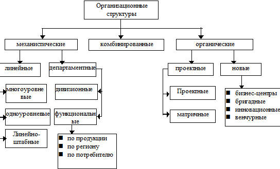 Дивизионная структура по потребителям включает элементы, направленные на обслуживание определенных категорий потребителей. При функциональной организации подразделения подразделяются на основе группировки функций в одно целое. При штабной структуре в составе организации присутствует штаб.