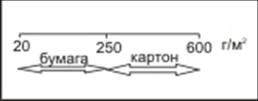 Совершенно условно принято считать, что листовой материал, имеющий массу одного квадратного метра (поверхностная плотность) выше 250 г называется картоном, а менее 250 г – бумагой (Рисунок 1) За рубежом граница между бумагой и картоном составляет 150 г/м2.