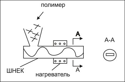 На рисунке представлена схема экструдера. Полимерное сырье из бункера при помощи шнека перемещается в обогреваемую часть аппарата, расплавляется там и выдавливается сквозь тонкую щель.