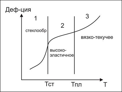 Полимер может существовать только в твердых и жидких состояниях. Для твердого состояния характерно наличие трехфазовых состояния: стеклообразное, высокоэластичное и вязкотекучее. Поведение полимеров описывается термомеханической кривой.