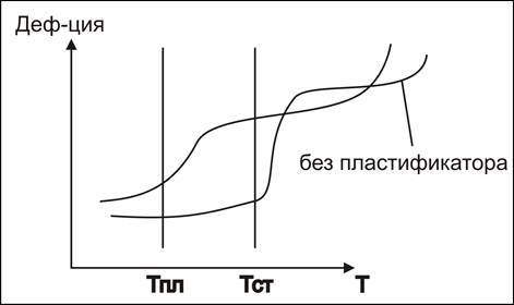 На рисунке представлены две термодинамические кривые полимеров: один с добавкой пластификатора, другой – нет. Очевидно, что кривая с пластификатором сместилась влево, т. е. tст. полимера с пластификатором стала ниже, и рабочий диапазон эксплуатации полимера расширяется. Пластификаторы – низкомолекулярные вещества, которые способны растворить полимер. Однако, т. к. кол-во пластификатора не превышает 5 %, то пластификатор способен только «разморозить» некоторые участки полимера. В качестве пластификатора используют некоторые эфиры фосфорной кислоты (трибутилфосфат).