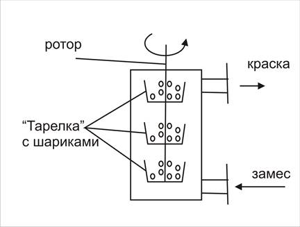 Бисерная мельница состоит из корпуса, внутри которого расположен вертикальный ротор. Ротор снабжен рядом дисков с бортами (тарелки). В тарелки укладывают мелкие шарики из стекла или другого материала. Размер шариков от 0,5 до 5 мм. Бисерные мельницы имеют рубашки для охлаждения. Размол происходит не из-за того, что шарики бьют по пигменту, пигмент в 100 раз меньше, чем диаметр шарика. Просто шарики, вращаясь, создают вокруг себя турбулентное вращение, а шарики разного размера – разное вращение. Возникает градиент и частички друг о друга трутся. Происходит операция ПЕРЕТИР.