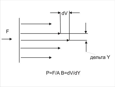 На рисунке представлена схема течения жидкости. Установлено, что скорость слоев жидкости отличается друг от друга в зависимости от того, где эти слои расположены. F – сила действующая на жидкость, А – поверхность соприкосновения слоев, Р – напряжение сдвига, В – скорость деформации жидкости.