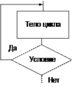В этом виде цикла условие стоит после тела цикла, поэтому этот цикл называют с постусловием. Тело цикла повторяется, пока выполняется условие. Тело цикла первый раз выполняется без проверки условия. Выход из цикла при не выполнении условия.