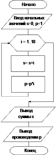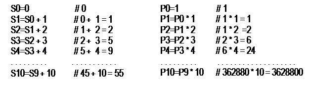 Рассмотрим процесс накопления S суммы и P произведения чисел от 1 до 10.