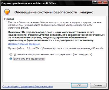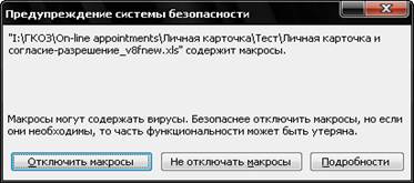 выберете ”Не отключать макросы” и Вы сможете в дальнейшем использовать весь функционал е-формы для ее быстрого заполнения.