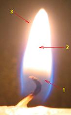 Внутренняя зона (1) заполнена парами и продуктами разложения, выделяющимися из горючего вещества в результате его нагревания. Количество диффундирующего из окружающего воздуха кислорода в этой зоне мало и температура в этой зоне сравнительно невысока. На фотографии хорошо видно что первая зона имеет характерный окрас, усиливающийся к краям зоны, что связано с тем что в этой зоне происходит неполное горение с образованием СO являющимся источником синеватого окраса. По мере приближения к краям зоны количество диффундирующего кислорода увеличивается, и горение идет более интенсивно, что хорошо заметно по усилению окраса. В зоне (2), куда частично, проникает кислород воздуха, происходит окисление паров и продуктов разложения, но вследствие недостаточности кислорода именно в этой зоне происходит осмоление и образование мелких частиц угля и поэтому эта зона ярко светится (напомним, что свечение пламени обусловлено наличием в пламени взвешенных частиц твердой фазы). Температура в этой зоне значительно выше, чем в зоне (1). В зоне (3) происходит догорание продуктов, образовавшихся уже в зоне (2), и частично тех паров и продуктов разложения, которые не успели прореагировать в зоне (2). Зона (3) содержит самое большое количество диффундировавшего кислорода т.к. она является самой внешней и имеет наибольшую поверхность. При достатке кислорода происходит полное окисление паров до газообразных продуктов, поэтому именно в этой зоне выделяется наибольшее количество тепла. Температура в этой зоне еще выше, чем в зоне (2), но яркости пламени уже нет, т.к. в зоне почти отсутствуют частицы недогоревшей твердой фазы.