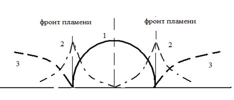 Эта схема отражает процессы диффузии, происходящие в пламени. Образующиеся в зоне горения продукты сгорания диффундируют как в воздух, так и в горючие пары и газы.