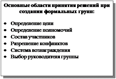 Рабочие группы, созданные формальным путем, должны иметь четко определенную цель своей деятельности. Эта цель должна быть не только зафиксирована в количественных и качественных показателях, но и иметь временной график выполнения. В этом деятельность формальных групп схожа с работой над проектами. Во многих случаях команда самостоятельно устанавливает краткосрочные цели своей деятельности, соответствующие целям организации и утверждаемые руководством компании.