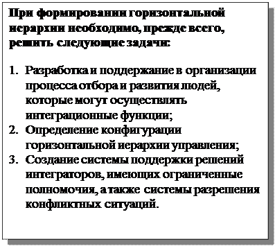 Создание горизонтальной иерархии формальных межфункциональных групп – наиболее трудная и дорогостоящая из всех форм горизонтальной организации. Высокие затраты на нее связаны с наймом менеджеров, задачей которых является интегрирование работы целых коллективов специалистов разных направлений. К этим затратам добавляются затраты на создание неформальных и формальных групп.