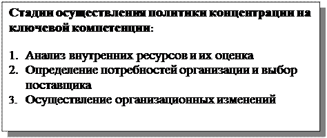 Большинство организаций, успешно проводящих политику концентрации на ключевой компетенции и привлечения внешних ресурсов, проходят несколько стадий в ее осуществлении.