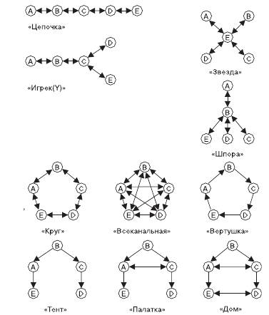 Линия, связывающая две организационные единицы, называется каналом. Совокупность каналов передачи или обмене информацией связывающих несколько организационных единиц, образует коммуникационную сеть. В коммуникационной сети в процессе коммуникации происходит соединение определенным образом людей с помощью информационных потоков. Типы коммуникационных сетей в группах представлены на рис. 7.6.1.