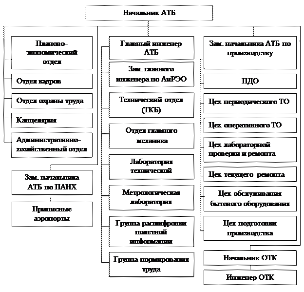 Основными производственно-структурными подразделениями АТБ являются: цех (цехи) периодического технического обслуживания; цех (цехи) оперативного технического обслуживания; цех (участок) текущего ремонта; цех (участок) лабораторных проверок и ремонта авиационного и радиоэлектронного оборудования; цех (участок) обслуживания бытового оборудования; цех (участок) подготовки производства. Главный инженер является заместителем начальника АТБ. Он осуществляет техническое руководство процессом технической эксплуатации AT на авиапредприятии. В его обязанности входит совершенствование организационных форм и методов ТОиР AT, внедрение в производство прогрессивной технологии, научной организации труда, передового опыта, новых средств механизации ТО и диагностирования АТ, последних достижений науки и техники.