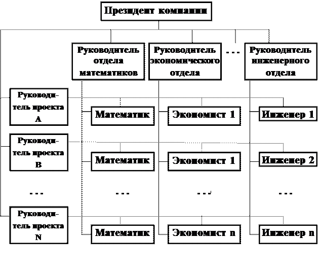 Матричные структуры менеджмента, называемые в проектных организациях еще программно-целевыми, объединяют в себе два начала структурного деления: проектное и функциональное (см. рисунок 3.13). Т.е. происходит деление организации на структурные подразделения и, вместе с тем, выделяются руководители проектов, находящиеся в непосредственном подчинении у руководителя организации. Этим руководителям проектов временно или только для выполнения строго определенных работ подчиняются сотрудники функциональных подразделений. Но по всем вопросам, выходящим за рамки работы над проектом, эти сотрудники подчинены руководителям своих функциональных подразделений, в распоряжении которых находится и необходимое исполнителям оборудование.