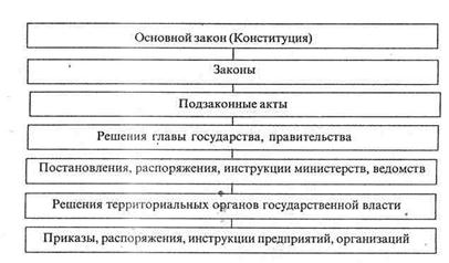 Всю систему актов нормативно-правового содержания можно представить в виде определенной логической схемы (рисунок 4.1), начинай от основного закона (конституции страны) и заканчивая рабочими инструкциями.