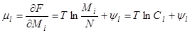 Здесь m0 – химический потенциал чистого растворителя, а N и Mi – соответственно число молекул растворителя и число мицелл. Функция yi(Р,Т) представляет собой усредненную потенциальную энергию взаимодействия мицеллы Mi с окружающими молекулами растворителя. Далее можно обычным образом ввести парциальные химические потенциалы растворителя и мицелл.