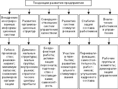 Современные тенденции развития организации. Главным свойством организации будущего, как показывают многочисленные исследования, является гибкость, постоянное приспособление к динамичной окружающей среде. Это, в свою очередь, потребует постоянной высокой отдачи персонала, развития творчества, самостоятельности, демократизации управления и т. п. Отсюда вытекают современные тенденции развития организаций, предполагающие повышение значимости таких свойств, как бо льшая гибкость, приверженность индивидам, преимущественное использование команд, высокая внутренняя конкурентоспособность (рис. 9.1.1).