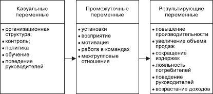 К каузальным переменным относятся факторы, на которые имеет возможность оказать непосредственное влияние менеджмент организации: организационная структура, контроль, политика, обучение, широкий диапазон образцов поведения руководителей и пр. Изменение каузальных переменных, в свою очередь, оказывает влияние на промежуточные переменные – установки, восприятие, мотивацию, квалификацию сотрудников, а также работу в командах и отношение между группами. Наконец, результирующие переменные – это цели, которые преследуют менеджеры: увеличение объема продаж, сокращение издержек и др. (рис. 9.1.3).