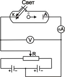 Первые фундаментальные исследования фотоэффекта выполнены русским ученым А. Г. Столетовым. Принципиальная схема для исследования фотоэффекта приведена на рис. 1. Два электрода (катод К из исследуемого металла и анод А – в схеме Столетова применялась металлическая сетка) в вакуумной трубке подключены к батарее так, что с помощью потенциометра R можно изменять не только значение, но и знак подаваемого на них напряжения. Ток, возникающий при освещении катода монохроматическим светом (через кварцевое окошко), измеряется включенным в цепь миллиамперметром. Облучая катод светом различных длин волн, Столетов установил следующие закономерности, не утратившие своего значения до нашего времени: 1) наиболее эффективное действие оказывает ультрафиолетовое излучение; 2) под действием света вещество теряет только отрицательные заряды; 3) сила тока, возникающего под действием света, прямо пропорциональна его интенсивности.