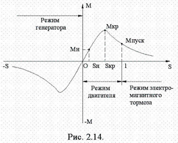 Выражение для электромагнитного момента (*) справедливо для любого режима работы и может быть использовано для построения зависимости момента от скольжения при изменении последнего от +∞ до -∞ (рис. 2.14).