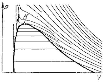 Через точку К проходит изотерма, на границе которой происходит переход непосредственно из жидкости в перегретый пар. При температуре и давлении выше критических вещество может находиться только в жидком или газообразном (сухой перегретый пар) состоянии.