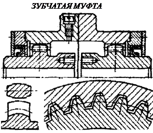 Наиболее популярна конструкция зубчатой муфты. Она компенсирует осевые, радиальные и угловые смещения валов. Состоит из двух втулок (полумуфт с зубьями) и надетой на них обоймы с внутренними зубьями. Зубчатые зацепления выполняют с боковым зазором; зубьям придают бочкообразную форму; венцы полумуфт располагают на некотором расстоянии друг от друга. Зубчатые муфты малы и легки, весьма грузоподъёмны (до 100000 кГм), высокооборотны.