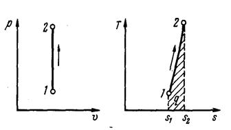 | Рис. 3. Изображение изохорного процесса в р, v- и Т, s - координатах |