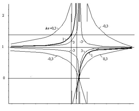 - жирные линии, соответствующие АТ = 1, общеизвестны для политропных процессов из курсов термодинамики; при АТ ≠ 1 линии теплоёмкости протекают подобно линиям политропного процесса;