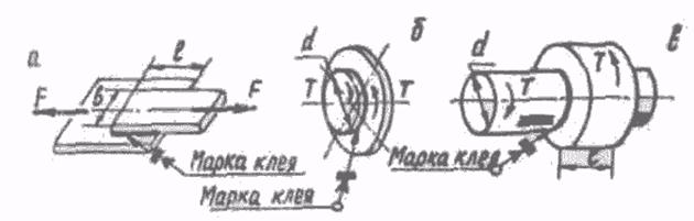 Прочность соединения зависит от материалов деталей, качества поверхности, температуры среды, толщины слоя клея (оптимальная величина 0,05...0,15 мм) и ряда других факторов. По временем прочность снижается из-за изменения механических свойств клея при его старении. В силу этого при определения допускаемых напряжений соединения принимают коэффициент запаса s по отношению к предельным характеристикам s = 3...5.