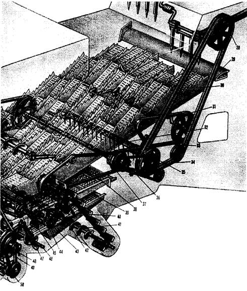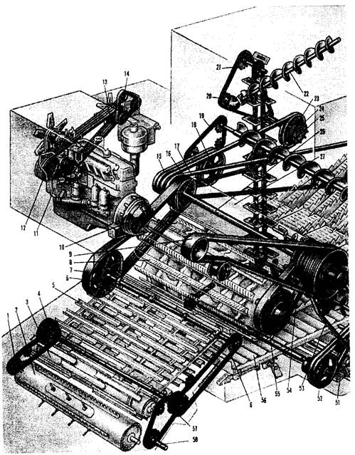 15- двухручьевой клиноременный привод выгрузного устройства бункера; 16- клиноременный привод зернового элеватора и загрузочного шнека бункера; 17 - клиноременный привод заднего контрпривода; 18 - контрпривод выгрузного устройства бункера; 19 - цепной привод выгрузного шнека бункера; 20 - ведущая звездочка загрузочного шнека; 21 - ведущая звездочка скребкового транспортера; 22 - загрузочный шнек бункера; 23 - контрпривод зернового элеватора и загрузочного шнека; 24 - горизонтальный выгрузной шнек; 25 - скребковый транспортер зернового элеватора; 26 - главный контрпривод; 27 - отбойный битер (установлен на валу главного контрпривода); 28 - ведущий шкив вала соломопрессовщика; 29 - щиток сброса соломы;.50 - соломотряс; 31 - ведущий шкив вала соломотряса; 32 - половонабиватель; 33 - клиноременный привод соломотряса; 34 - двухручьевой клиноременный привод соломоподпрессовщика; 35 - ведущая звездочка вала половонабивателя; 36 - цепная передача; 37 - вал заднего контрпривода; 38 - верхнее решето очистки; 39 - нижнее решето очистки; 40 - транспортер колосового элеватора; 41 - колосовой шнек; 42 - шкив привода колосового элеватора и распределительного шнека; 43 - ведущая звездочка вала распределительного шнека; 44 - распределительный шнек домолачивающего устройства; 45 - домолачивающее устройство; 46 - зерновой шнек; 47 - ведущий шкив вала домолачивающего устройства; 48 - ведущий шкив вариатора вентилятора; 49 - вариаторный ремень; 50 - ведомый шкив вариатора вентилятора; 51 - вентилятор; 52 - ведущий шкив вала привода транспортной доски; 53 - клиноременной привод вентилятора; 54 - вариаторный ремень; 55 - ведомый шкив вариатора барабана; 56 - транспортная доска; 57 - контрпривод наклонной камеры; 58 - контрпривод жатки.