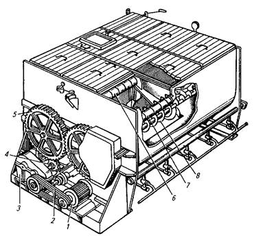 3 - редуктор; 4, 5 – зубчатые передачи; 6, 7 - валы лопастных мешалок; 8 - выгрузной шнек.