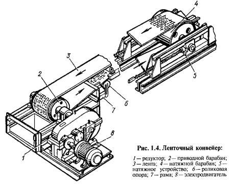 Ленточные конвейеры предназначены для транспортировки сыпучих, порошкообразных, мелко- и среднекусковых, а также небольших штучных грузов. Это самые распространенные транспортирующие машины. Их преимущества - простота и универсальность конструкции, небольшая металлоемкость, малый расход энергии. Ленточными конвейерами можно перемещать грузы как в горизонтальном направлении, так и под небольшим углом наклона, а при оборудовании специальными лентами или дополнительными устройствами - под значительным углом наклона.