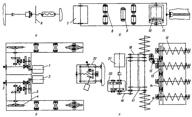 а - механизм подъема отгружающего транспортера; б - привод отгружающего транспортера; в - привод ходовой части; г -привод ковшового элеватора; 1, 2, 10, 21 - электродвигатели; 3 - редуктор; 4 - приводная звездочка; 5 - вал; 6 - маховик; 7 - барабан; 8 - роликовая опора рабочей ветви; 9 - роликовая опора холостой ветви; 11 - планетарный редуктор; 12 - рушитель; 13 - зубчатое колесо; 14 - паразитная шестерня; 15 - конический редуктор; 16 - подгребающий шнек; 17 - ковшовый элеватор; 18, 19 - цепные передачи; 20 - цилиндрический соосный редуктор; 22 - винтовой механизм подъема.