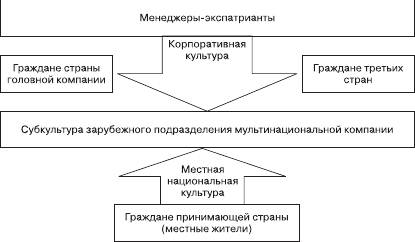 Безусловно, материнская компания оказывает влияние на нормы поведения сотрудников дочерних подразделений корпорации, расположенных в других странах. Однако персонал, в основном состоящий из местных жителей, является носителем национальной культуры и это не может не оказывать влияния на культуру дочерней компании. В результате приспособления организационной культуры к местным культурным особенностям в зарубежных подразделениях формируется так называемая «субкультура» (рис. 13.4.1).