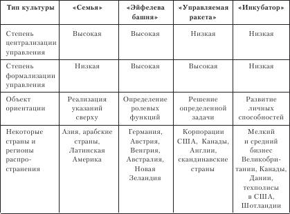 Различным странам в известной мере соответствует определенный тип организационной культуры, имеющий отличительные признаки и характеристики, например, различные соотношения формального – неформального, индивидуализма—коллективизма, долгосрочной—краткосрочной ориентации. Известен ряд классификаций типов, или моделей организационной (управленческой) культуры, предложенных различными учеными, среди которых получила признание типология, разработанная Ф. Тромпенаарсом и Ч. ХампденнТернером. В ее основе такие организационные характеристики, как степень централизации управления, степень формализации управления и целевая ориентация деятельности. Выделены четыре типа организационной культуры: «семья», «Эйфелева башня», «управляемая ракета», «инкубатор» (табл. 13.4.1).