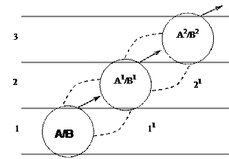 Всем вещам, явлениям, процессам внутренне присущи противоположности, которые обусловливают их целостность. Борьба противоположностей приводит к самодвижению, саморазвитию. Саморазвитие осуществляется следующим образом. В возникшей вещи (1) существуют свои противоположности, среди них и основные (А, В), которые вначале незаметны (находятся в состоянии относительного тождества), но, взаимодействуя, и взаимоисключая друг друга, приходят в состояние противоречия и борьбы. Под воздействием друг друга противоположности изменяются; противоречие, нарастая, доходит до высшей стадии – конфликта (11), при этом происходит разрешение противоречия заменой старого качества новым (2), с новыми, вначале скрытыми, противоположностями (А1, В1), которые, затем приходят в состояние противоречия и борьбы. Противоречие, нарастая, достигает высшей фазы – конфликта (21) и разрешается заменой старого качества новым (3), с новыми, вначале скрытыми, противоположностями (А2, В2) и т.д.. Образуется непрерывная цепь развития с переходами от низших ступеней организации к более высоким.