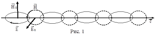 Т.о. любой проводник, по которому течет переменный ток, любая совокупность электрических зарядов, совершающих колебания, образуют в среде вокруг себя систему взаимопроникающих электрических и магнитных полей, распространяющихся в пространстве – т.е. электромагнитную волну (рис.1).