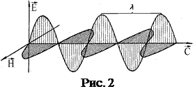 и каждый из них перпендикулярен вектору скорости волны с. Т.о. электромагнитные волны являются поперечными (рис.2).