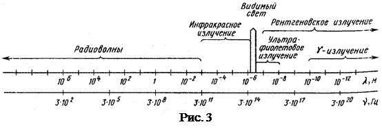 Из теории Максвелла вытекает, что все электромагнитные волны имеют общую природу, но в зависимости от частоты отличаются друг от друга, как механизмом образования, так и по своим свойствам. Это позволяет разделить весь интервал длин волн на отдельные виды (рис.3):