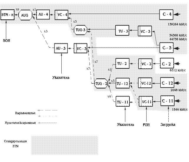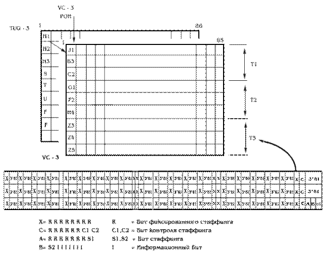Как видно из рисунка, в процессе загрузки потока 140 Мбит/с в синхронный транспортный модуль используются процедуры фиксированного выравнивания (биты R) и плавающего выравнивания (биты S, индикаторы С). Процедура фиксированного стаффинга используется чаще и связана с полями X, Y и Z. Процедура плавающего выравнивания связана с использованием полей Х и Z, причем непосредственно стаффинговые биты плавающего выравнивания передаются в поле Z. Поле Х содержит индикатор стаффинга, передаваемый периодически (до появления поля Z индикатор передается 5 раз).