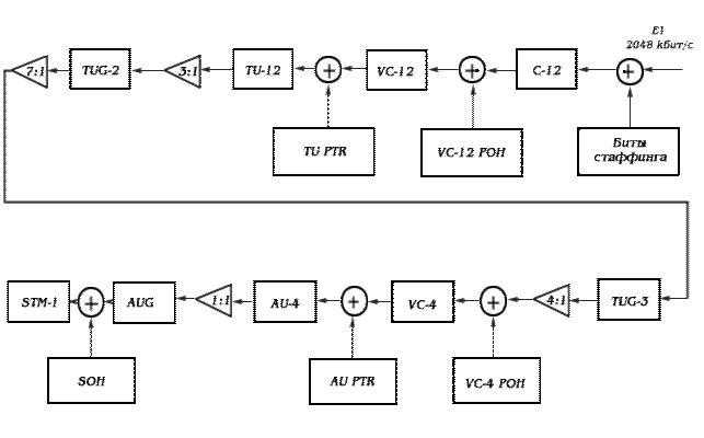 В качестве примера рассмотрим процесс формирования синхронного транспортного модуля STM-1 из нагрузки потока Е1 (рис.4.2).