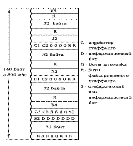В качестве примера рассмотрим загрузку потока 140 Мбит/с в транспортный модуль STM-1 (рис. 4.3).