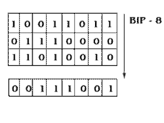 В системе SDH используется метод контроля параметров ошибки без отключения канала, который получил название метода контроля четности (Bit Interleaved Parity - В1Р). Этот метод, также как и CRC, является оценочным, но он дает хорошие результаты при анализе систем передачи SDH. Алгоритм контроля четности достаточно прост (рис.5.1). Контроль четности выполняется для конкретного блока данных цикла в пределах групп данных по 2, 8 и 24 бита (BIP-2, BIP-8 и В1Р-24 соответственно). Эти группы данных организуются в столбцы, затем для каждого столбца рассчитывается его четность, т.е. четное или нечетное количество единиц в столбце. Результат подсчета передается в виде кодового слова на приемную сторону. На приемной стороне делается аналогичный расчет, сравнивается с результатом и делается вывод о количестве ошибок четности. Результат сравнения передается в направлении, обратном передаче потока.