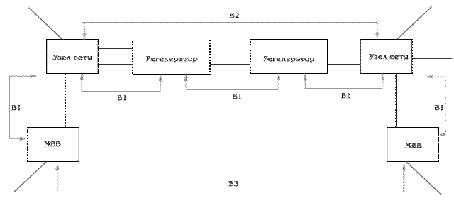 Метод контроля четности является оценочным, поскольку несколько ошибок могут компенс ровать друг друга в смысле контроля четности, однако этот метод дает приемлемый уровень оценки качества цифровой системы передачи. Поскольку технология SDH предусматривает создание секционных заголовков и заголовк пути, метод контроля четности дает возможность тестирования параметров цифровой системы передачи от секции к секции и от начала до конца маршрута. Для этого используются специальные байты (см. выше) в составе заголовков SОН и РОН. Например, количество ошибок, обнаруженно в канале В3 передается в байте G1 РОН VC-4 следующего цикла. На рис.5.2 представлена cxема посекционного мониторинга параметра ошибки BIP. Используемые для контроля четности байты связанные с ними участки цифровой системы передачи приведены в табл.5.1.