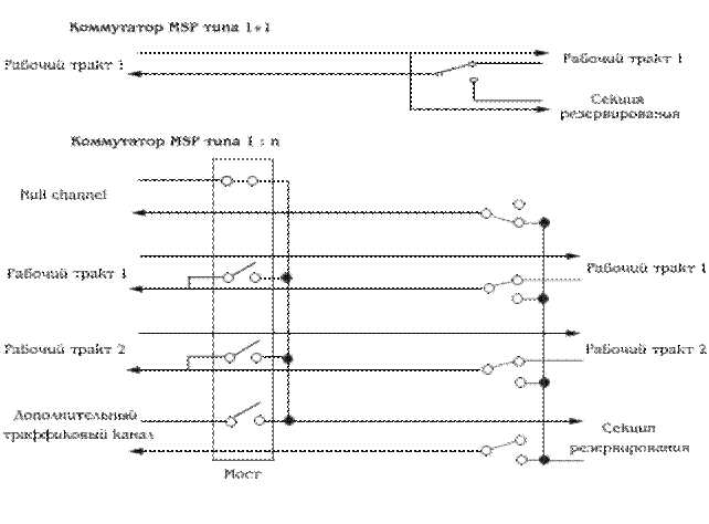 К современной цифровой первичной сети предъявляются повышенные требования в части параметров ее надежности. В связи с этим современные первичные сети строятся с использованием резервных трактов и коммутаторов, выполняющих оперативное переключение в случае неисправности на одном из каналов. В этом случае в состав системы передачи включаются цепи резервирования мультиплексорной секции (Multiplex Section Protection - MSP). Как было показано выше, в сети SDH осуществляется постоянный мониторинг параметров ошибки (процедура контроля четности BIP) и параметров связности. В случае значительного ухудшения качества передачи в мультиплексорной секции выполняется оперативное переключение (APS) на резервную мультиплексорную секцию. Это переключение выполняется коммутаторами. По типу резервирования различаются коммутаторы APS с архитектурой 1+1 и 1:n (рис.6.1).